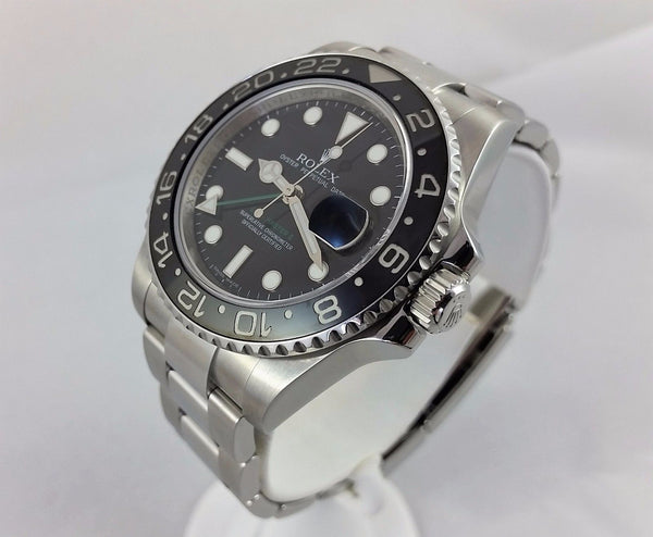 This is a genuine Rolex GMT-Master II Date Engraved Ceramic stainless steel with a black dial, green hand and is in excellent near new condition and includes inner & outer box, booklet, warranty card, leather wallet, tag. Reference # 116710. Quick-set, Sapphire Crystal, Screw-down Crown. Crisp, tight and appears like new condition.